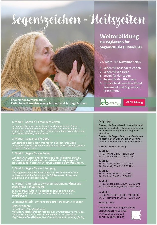 Dieser Lehrgang befähigt dazu, Segensrituale und -feiern einfühlsam, lebensnah und mit fachlicher Kompetenz zu gestalten und besondere Momente achtsam und liebevoll zu begleiten.